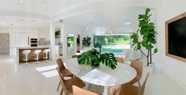 Exquisitely fully furnished modern living space with high ceilings and open airy spaces. White throughout, including large cool terrazzo tiles in the living area and wide-planked Siberian white wood in the bedrooms. High impact windows and doors and custom closets. Immaculately maintained high-end kitchen including marble counters and top of the line appliances. Large lush private canopied/tropical backyard with mature trees and nearly 1/2 acre fenced property with saltwater heated pool.