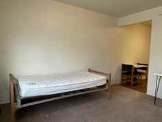This furnished apartment comes with a kitchen table and chairs, a built-in desk and chair, a dresser, and, optionally, a twin bed and mattress at no extra cost.