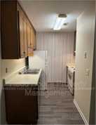This unit features wood-look plank flooring throughout and an open, living space. The private upstairs balcony is accessible via a glass sliding door. The kitchen includes classic wood cabinets, a stove, refrigerator, and dishwasher. The bedroom offers a large closet, and the unit is painted in neutral tones. Contact Redd House Property Management for details.