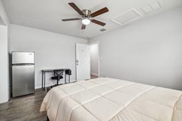 Extra-Large room size with Queen size bed, desk, nightstand, electronic deadbolt lock and 7.5 Cu. Ft. refrigerator