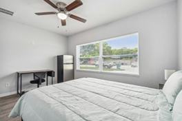 Cozy room size with Queen size bed, desk, nightstand, electronic deadbolt lock and 7.5 Cu. Ft. refrigerator with freezer. Optional wall mounted LED flat screen 43”, add $5 per week. Access to a shared full bathroom. Reach in closet.