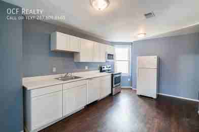 Located in the West Passyunk section of Philadelphia, this recently renovated 1 bedroom, 1 bath apartment boasts large bay windows, hardwood floors, a ton of pristine white cabinets and appliances that include a microwave, refrigerator and a stainless steel electric oven/stove. As you enter in the front door and up the stairs to this unit, you’re welcomed with a large open floor plan kitchen that leads to a front living room area which hosts large bay windows, allowing for plenty of sunlight throughout the day. The washer and dryer are also located here in this area for easy accessibility. Walk on through past the kitchen towards the back of the apartment and you’ll find a full bathroom consisting of a gorgeous, modern tile shower and a beautiful, bright sunny bedroom.