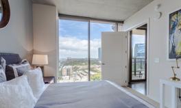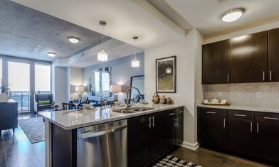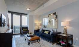 Unique Features: 9' ceilings with exposed concrete, Custom-framed bathroom mirrors, Deep Garden tubs*, Designer tiled walk-in showers, Dog wash station, Electronic home entry system, Floor-to-ceiling windows with solar shades, Full-sized washers and dryers, Granite countertops with subway tile backsplash, Hardwood floors with stylish cut berber carpet in bedrooms, Impressive walk-in closets, Open concept floorplans, Oversized island kitchens*, Pet friendly community, Private terraces with stunning downtown views*, Side-by-side refrigerators, Spacious Kitchen Pantries*, Stainless steel appliances with glass top stove, State-of-the-art 24-hour gym, Yoga, Pilates, and Cross-training room