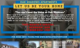 Description: Come by and check us out at Oak Shadows Apartments ! We are in the heart of Houston and have great move in specials and great rental rates you would love to lock in for a year. Come by and join our community today. We are under new management and have amazing new ideas coming to our property soon . Walk- ins/ appointments are welcomed . Office number 713-941-7700