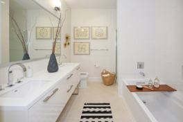 Beautiful spa inspired bathrooms with quartz countertops and select units large soaking tubs and separate stand up showers