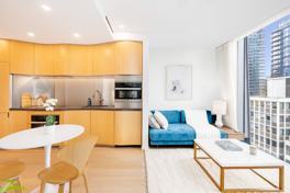 This fully furnished unit features an open kitchen featuring marble countertops and backsplash, fully integrated Miele appliances and striking curved oak cabinetry. Floor to ceiling windows in the living room provide for natural light, complete with remote window dressings. The spectacular bathroom is adorned with travertine marble, a soaker tub and rain shower, heated floors, a Toto electronic toilet, and a smart mirror with internet access.