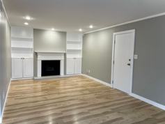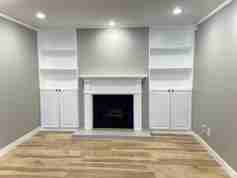 The unit opens into a living room with built in bookshelves and a decorative fireplace. The dining area includes additional built in shelving and access to a porch.