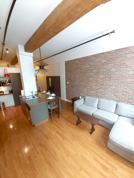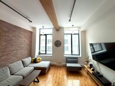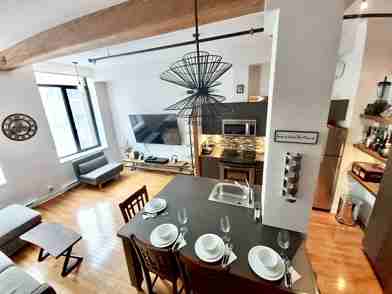 Beautiful industrial-style spacious loft with hardwood floors, high ceilings (11ft) and brick walls located in the prestigious Lowney 2 in the heart of Griffintown. The bedroom is very spacious- it fits a fully furnished bedroom set and a fully furnished nursery or office. Open concept kitchen-living area. Elegant custom kitchen cabinets with beautiful backsplash. Loft flooded with natural light from large full-length windows. Stunning views of the downtown skyline on the two terraces with patio sets, 4 barbecues and an in-ground pool as well as a glass urban chalet (lounge area) with fireplace. Access to a gym with pool with separate changing rooms for men and women, huge locker storage and workshop. Pet friendly building. Very well managed building with one elevator. Superior soundproofing. Close to all the amenities!
