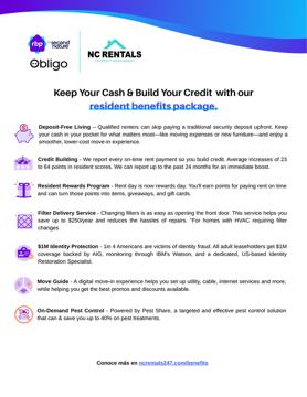En NC Rentals 247 ofrecemos beneficios adicionales diseñados para hacer la renta más fácil, accesible y conveniente. Todos los nuevos contratos incluyen nuestro Paquete de Beneficios para Residentes (RBP), un programa mensual obligatorio que permite a los inquilinos construir historial de crédito mediante pagos puntuales de renta, acceder a recompensas por renta y que también incluye control de plagas, asistencia para la activación de servicios y protección de identidad. El costo mensual de este programa es de $30. Adicionalmente, los solicitantes que califiquen pueden tener la opción de mudarse sin pagar un depósito de seguridad tradicional, ayudando a reducir los costos iniciales. Esta opción es opcional y está sujeta a aprobación.