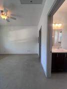 This updated home has beautiful concrete flooring throughout, recessed kitchen lighting, Corian countertops, imperfect-smooth wall texture, gas range, dishwasher, ceiling fans in living and bedroom.  Walk-in closet in bedroom with shelving.