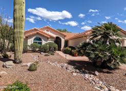 AVAILABLE MAY 1st- OCTOBER 2026. FURNISHED Updated TOPAZ Model, 3 Bedrooms/2 Baths, Remodeled Kitchen with Stainless Appliances, Well-furnished and CLEAN! Quartz Counter tops, Over-sized Ceramic Flooring, New Carpet, Murphy Bed included OFFICE/Third bedroom. Mature Trees and High Block wall surround rear yard with mountain views. All NEWER Furnishings! Uncluttered and meticulously maintained by Owner. Includes NEW SPA TUB AND GOLF CART! Pets with owners' approval. PLEASE NOTE: NOT AVAILABLE FOR WINTER SEASON 2026-2027.