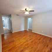 Retreat to the tranquil haven of the master bedroom, where light brown/beige real wood floors and a ceiling fan provide a soothing sanctuary for rest and relaxation. The attached master bathroom offers tiled flooring and a convenient shower tub combo, ensuring your comfort and convenience.