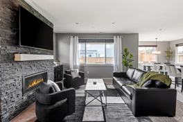 Step inside and discover an expansive layout filled with natural light and clean, contemporary finishes. The main level features a generous living area with plush seating, a cozy fireplace, and a 70-inch TV—perfect for relaxing after a long day or hosting family movie nights.