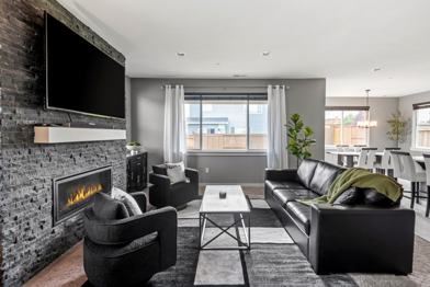 Step inside and discover an expansive layout filled with natural light and clean, contemporary finishes. The main level features a generous living area with plush seating, a cozy fireplace, and a 60-inch TV—perfect for relaxing after a long day or hosting family movie nights.