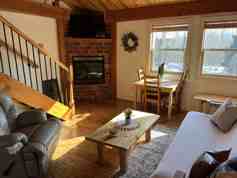 A rustic yet cozy cottage, fully furnished and available for flexible timeframes! Screened timber patio, vaulted ceilings with a cozy fireplace, loads of windows, hardwood flooring, well-appointed kitchen with slate tile floors. Tiled bathroom with a jetted tub and 1 bedroom completes the first floor. Upstairs, escape to the vaulted loft bedroom that features a bonus half bathroom and king-sized bed. Futon couch in the living room and a 50" smart TV!