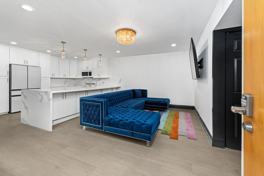 Additional highlights include keyless entry, a mounted smart flat screen TV, curated lighting, and a cohesive contemporary palette throughout. One assigned parking space and a private storage locker are included.