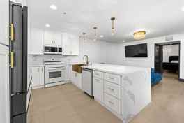 This 682 sq ft home offers a clean, open-concept layout with wide plank flooring and a designer kitchen featuring a quartz waterfall island, white shaker cabinetry, brass hardware, and stainless steel appliances.