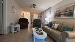 Come enjoy the Florida weather this SUMMER (May through November) in this immaculate, FULLY FURNISHED 2 bed, 2 bath, 1 car carport villa ON the Golf Course in Seven Spring Golf & Country Club, a wonderful gated community! This END unit has great views of the golf course from every window and has an enclosed Florida room to enjoy it all from. There is also a lovely open patio out back, perfect for grilling on the gas grill! Fully furnished with linens, towels, dishes, cookware, and everything you will need for a carefree vacation! This unit has a KING sized bed in the master and shower in master bath. The guest bath has the full tub and shower set up at the front of the unit with (new in 2024) Queen bed in the 2nd bedroom. The kitchen has refrigerator, range, built in microwave, dishwasher, disposal and a pass through to the dining area so you don't feel trapped in the kitchen while everyone else is having fun in the other room! The villa is light, bright and spotlessly clean with tile floors throughout! You'll be able to relax in the comfortable living room while you watch the sun set over the golf course every evening, unless you are out there swinging a club! Located in the Seven Springs Golf and Country Club, this community is sought after and for good reason! There is a laundromat on site and a community pool just minutes away, as well as the great golf course and clubhouse! The rent INCLUDES the water, sewer, trash, first $100/mo of electric (tenant responsibility for over $100/mo) cable, internet and community services! Fully refundable Security deposit of $500, community application fee of $150, 1st time tenant application fee of $40/person but the application fee for returning tenants is waived. Don't forget the 12% tourist tax and there is a $200 cleaning fee. All funds must be received prior to arrival. We take care of registering you with the HOA and once you get past the front gate, you are free to enjoy your stay without having a thing to worry about
