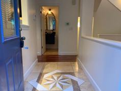 Step inside to a striking entryway featuring tiled flooring with a compass rose design. The kitchen is a chef’s delight with stainless steel appliances, a built-in oven and microwave, stovetop, deep sink, abundant counter space, and rich dark-wood cabinetry accented by textured glass panels. Hardwood floors flow throughout the main living areas, where a formal dining room with pendant lighting connects seamlessly to a spacious living room. Large windows frame the views and fill the space with natural light, while a gas fireplace adds warmth.
