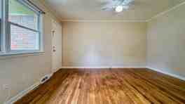 Spacious living area with hardwood floors and ceiling fan, lots of natural lighting!