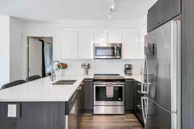 Large top floor unit featuring an efficient 1 bed 1 bath layout, 600 sqft of interior space, South facing unit brightly lit with natural light alongside a large balcony facing the quiet side of town and overlooking an extensive mountain view. The kitchen features soft closing cabinets, under-mount sink, a large kitchen peninsula, in-suite laundry, and stainless steel appliances. Facilities include Elevator and Fitness Centre. 1 parking stall and 1 locker included.