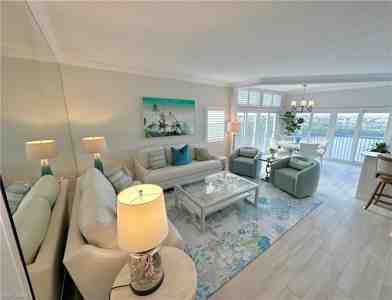 Available as of April 1, 2026 - $8,500/mo IN SEASON (Dec thru April) or $5,000/mo off season/annual. This stunning top floor, end-unit WATERFRONT Penthouse boasts 3 bedrooms & 2 bathrooms with bay views from all 3 sides, with higher ceilings than all the lower floors. This is the largest floorplan in the building. Recently completely repainted and tastefully renovated, this slice of paradise showcases Florida's coastal living vibe. You are just 4 blocks to the beautiful, white sandy Gulf beaches. This rarely available top floor condo screams beach living with an abundance of natural light, magnified by the newly installed full wall of mirrors in the great room, and great south-east/west exposures all day for the sunrises and sunsets. Watch the dolphins and manatees play in Hickory Bay right below your main living and kitchen. Beautiful neutral tile flooring throughout, impact glass sliders/windows. Impeccable water views from all 3 bedrooms, one guest room has a custom built-in queen size Murphy Bed. Enjoy exterior dining out on the building patio with a gas grill off of the clubroom. There is Gulf access from the many available community boat docks + kayak launch. One assigned coverd parking in garage and ample guest parking for building. Relax at the bayfront pool and hot tub, & walk to local restaurants, Coconut Jacks, Fish House or Docs Beach House on the sand. Upgrades to building include keyless entry, beautifully refurbished pool, elevator, and relaxing community room on 1st floor. Enjoy Florida's finest waterfront living! Landlord prefers ,multiple months rental if in season months for inquiries.