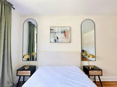 - Bedroom furniture includes: dresser, 65 inch HD TV, bed, mattress, desk, chair, curtains, art, table lamps