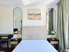 - Bedroom furniture includes: dresser, 65 inch HD TV, bed, mattress, desk, chair, curtains, art, table lamps