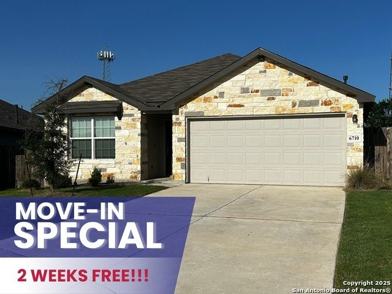 MOVE IN SPECIAL: 2 WEEKS FREE!* Welcome to your dream rental home near SeaWorld and Lackland Airforce Base! This stunning 4-bedroom, 2-bathroom single story home is located on a greenbelt in the Whisper Falls subdivision, a master planned community conveniently located off Highway 90. Experience the ultimate in resort-style living with amenities such as a pool, clubhouse, cabanas, playground, basketball court, and splash pads for kids. With major shopping and restaurants just a stone's throw away, you'll have everything you need right at your fingertips. The kitchen is an entertainer's delight, boasting ample cabinet space, granite counters, a huge island bar, stainless steel Whirlpool appliances, gas cooking, and LED canned recessed lights. The open floor plan features an oversized island bar overlooking the dining area and living room, making it perfect for hosting family and friends. Relax in the privacy of your spacious primary bedroom retreat, tucked away at the back of the house for ultimate tranquility. Enjoy a separate shower stall and a huge garden tub, a walk-in closet, and dual vanities. Every bedroom and the living room also has a ceiling fan for added comfort. Don't miss out on the chance to make this amazing rental home your own. *Owner will be adding a refrigerator with an approved applicant*