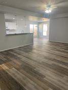 The kitchen features a stove, dishwasher, microwave, custom cabinets, and vinyl flooring that extends throughout the home, which means NO carpet. Step outside to a relaxing patio and a backyard with white rock landscaping.