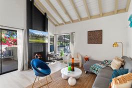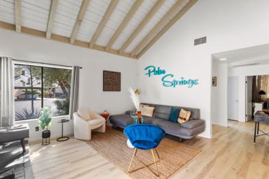This end unit has 1125 sq. ft., ample private patio with BBQ and Fire Pit, brand new and fully equipped kitchen, living room with Smart TV, classic Palm Springs decor and is perfect for up to 4 people (including a furry one!).