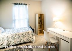 Your private space sits on the upper level: a furnished 10′×14′ bedroom with a comfortable bed, s, and extra storage beside the closet. A large shared bathroom is next to your door. You're welcome to relax downstairs— a bright living room, a modern kitchen, and a cozy family room. High-speed internet and all utilities are set up so you don't have to worry about spending time starting them up. Convenient street parking out front.