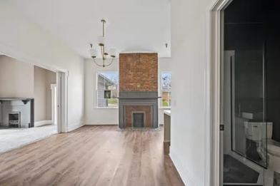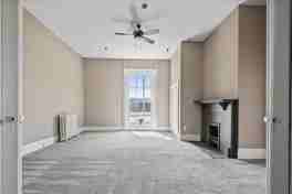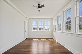 This bright, character-filled apartment features high ceilings, lots of natural light, large windows, fireplaces, and exposed brick that mix historic charm with modern updates. The kitchen has stainless steel appliances, a small island and open shelving, while the bathroom has been updated with a walk-in shower and other design features.