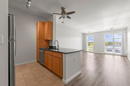 The open kitchen features granite countertops, stainless steel appliances, and a breakfast bar. Additional highlights include a spacious walk-in closet, in-unit laundry, central air conditioning, private storage, and assigned parking conveniently located near the building entrance.