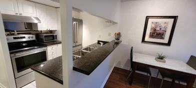 Occupancy for the furnished, 1 + den 715 sq-ft unit. Utilities excluded. Included modern appliances: fridge, dishwasher, stove, washer, and dryer. Building amenities include: gym, party room, sauna and rooftop patio.