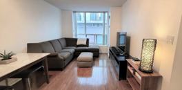 Occupancy for the 715 sq-ft fully furnished 1-bed + den, 1-bath condo unit. Hydro/heat/water included. Included modern appliances: fridge, dishwasher, stove, microwave, washer, and dryer. Central AC and heating. Pet-friendly. Building amenities include: fitness facility, yoga studio, elevator, concierge, guest room, BBQ, garden, and bike storage