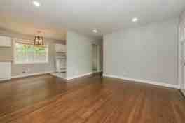 Inside, the home opens into a bright living area featuring hardwood flooring, neutral paint, and large windows that fill the space with natural light. The dining area transitions smoothly from the living room and leads into a kitchen equipped with white cabinetry, tile flooring, and ample counter space, ideal for preparing meals with ease.