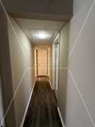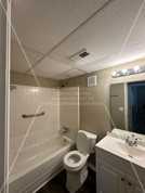 The bathroom offers under the sink cabinet space and a deep bathtub to relax in after a long day at work.