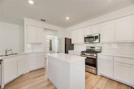 The heart of the home is the impressive kitchen, featuring sleek quartz countertops, stainless steel appliances, stylish cabinetry, and a generous island ideal for meal prep and casual dining. Large windows throughout the home bring in abundant natural light, enhancing the sense of space and highlighting the contemporary finishes.