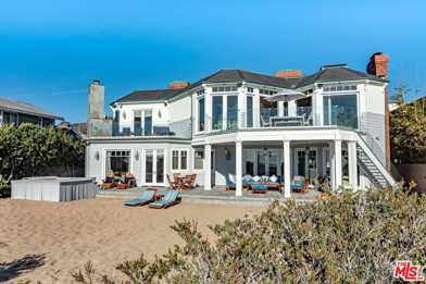 Beautiful Cape Cod style beach house, 80 foot lot on exclusive Broad Beach. From every bedroom, you wake up and fall sleep to the sound of waves. This home is elegantly decorated, with open-beamed ceilings, lots of windows and natural light. It features 20 foot open beamed ceilings, and French doors leading out to the private patio on the beach and gardens in the back. Sleep to the peaceful sounds of the ocean in one of two spectacular master suites. Enjoy the outdoor fireplace on the private master deck. The master bathroom is finished with custom marble and tile and has a separate over size steam shower and deep soaking tub to relax in after a day at the beach. There are 6 bedrms & office in the main house w/2 spectacular master suites. A luxurious master bath w/custom marble & tile, over size steam shower & deep soaking tub. Gourmet catering kitchen is fully equipped featuring granite counters, Viking appliances, 3 ovens and 2 dishwashers. Sauna and outdoor spa. Guesthouse with full kitchen has a large bedroom and 1 1/2 baths. Available for shorter terms/seasonal/vacation-stay via separate luxury rental agency.