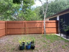 Welcome to the opportunity to secure a 3 bedroom/2bath duplex side A! Cozy and inviting, spanning 1281sqft. Offers 3 Bedrooms, 2 Baths, 1 Car garage with garage door opener system and an extra refrigerator in the garage!. There is a large open concept floor plan, large kitchen with a full set of appliances including a dishwasher, 42 inch kitchen cabinets with granite countertops, a lot of storage space and a washer dryer are included. House features generous circulation space, high vaulted ceilings with multiple recessed and light fixtures for an open and bright feel, tile flooring throughout and ceiling fans in most areas. All bedrooms are well-sized. Unit has been impeccably cared for. Outside, you'll find plenty of room! Features a screened in back porch and a fully fenced in backyard. This property boasts an ideal location in a highly sought-after area, offering proximity to schools: (Indian Trails Middle School-Distance: 1.8mi, Belle Terre Elementary School-Distance: 2.1mi, Matanzas High School-Distance: 3.4mi) churches, and the picturesque sandy beaches. Lawn maintenance is INCLUDED!