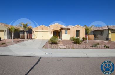 Available Now! Amazing 4 bedroom, 3 bath single story home in a Great Goodyear community! With over 2,400 Sq Ft of total living space, find a nice neutral interior, formal dining, & welcoming great room entry! Eat-in kitchen includes appliances, granite countertops, upgraded fixtures, walk-in pantry, & expansive center island/breakfast bar! Separate dining space. Ample living space/flexibility throughout. Neutral paint + tile flooring in All the right places! Primary suite includes Full bath! Ceiling fans + blinds throughout. Generously sized secondary bedrooms. Enjoy a lovely backyard with covered patio, grass area, & mature landscaping. 3 Car Garage! This home is in a Wonderful community offering children’s playgrounds & biking/walking trails throughout! Check It OUT!
