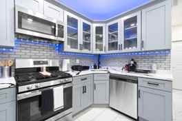 Step inside to discover a thoughtfully designed space blending sophistication with functionality. The open-concept living area features rich hardwood floors, recessed lighting, and a warm, inviting atmosphere. The upgraded kitchen steals the spotlight with its modern gray shaker cabinets, stainless steel appliances, subway-tile backsplash, and marble-style countertops accented by ambient lighting ideal for both everyday meals and weekend entertaining.