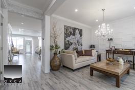 The main floor features 9-foot ceilings adorned with crown molding and durable laminate flooring, creating an inviting ambiance. The gourmet kitchen is a chef's dream, featuring wide gray shaker-style cabinets, quartz countertops, an under-mount sink, and top-of-the-line ceiling-height appliances, including a gas range. The large island with a custom glass-enclosed wine rack seamlessly transitions into the dining area, while the private family room with a cozy gas fireplace provides the perfect retreat.