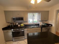 Modern Kitchen with updated appliances, plenty of cabinet space, granite countertops with an island.