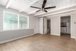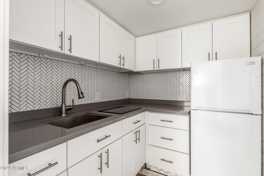 Low-maintenance efficiency unit with a spacious fenced backyard, pavers, and artificial grass. Interior features gray plank tile throughout, an open living space, and a tiled walk-in shower. Kitchen includes quartz countertop, tile backsplash, white cabinets with handles, electric cooktop, and refrigerator. Available for touring. PROMO: 1/2 OFF 2nd MONTH'S RENT