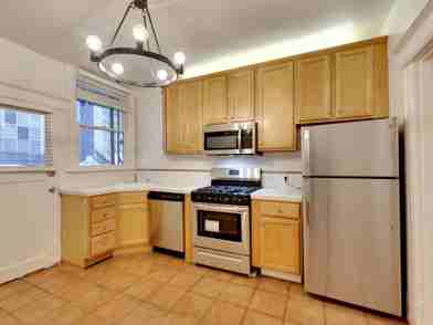 The tile floor kitchen features matching stainless steel appliances (dishwasher, gas stove/oven, refrigerator and microwave) and an abundance of cabinets, and is also large enough to accommodate a good size dining table. Just off the kitchen is the walk-in pantry with built-in shelving, drawers and cabinetry, offering tons of additional storage space. The updated, tile-floor bathroom features a tub/shower combination, as well as a classic pedestal sink. There is a small patio deck out the back of the unit, and the in-building laundry room is located just downstairs.