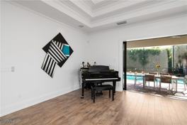 his stunning architecturally designed home boasts 4 bedrooms, 3 baths, and numerous upgrades. Enter through a magnificent foyer into a great room with 14' multi-step tray ceilings, offering a breathtaking view of the screened-in heated pool and hot tub. The pool features smart automation, a salt system, and LED lights. The spacious kitchen is equipped with new quartz countertops and stainless steel appliances. Enjoy a premium surround sound system throughout the home, easily controlled via a mobile app. Built in 2016, this well-maintained home is located in the beautiful gated community of Montebello, adjacent to the Royal Poinciana Golf Course. It's conveniently close to fine dining, excellent schools, and just minutes from the beach and downtown Naples. Great Location