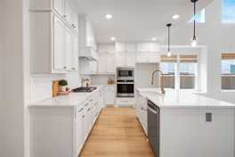 The chef’s kitchen is a dream, complete with a farmhouse sink, gleaming quartz countertops, gas cooktop, brass hardware, and custom cabinetry—ideal for both everyday living and entertaining.