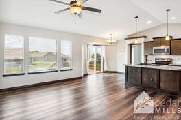 This super inviting 5 bedroom home is located just Northwest of 63rd and Rock in Derby. Upon entering you will immediately notice the contemporary plank floors and paint scheme along with open floor plan and new kitchen appliances. The master is beyond the kitchen, has en suite bath with custom wall paper and walks through to the laundry room.